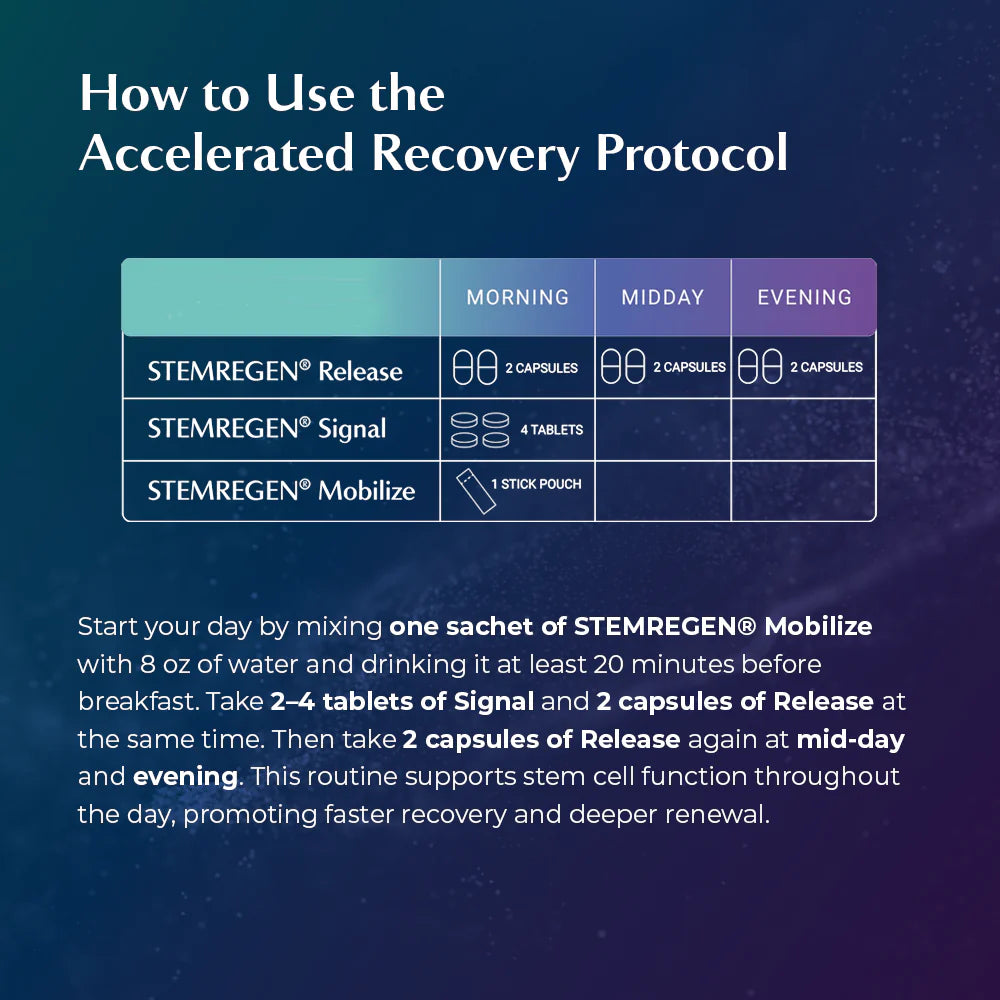 The STEMREGEN Accelerated Repair Protocol is our most advanced regenerative support bundle—designed for individuals requiring elevated and sustained stem cell activity. This comprehensive protocol includes three bottles of STEMREGEN Release, plus one each of Signal and Mobilize, to synergistically stimulate stem cell release, migration, and targeted delivery throughout the body.