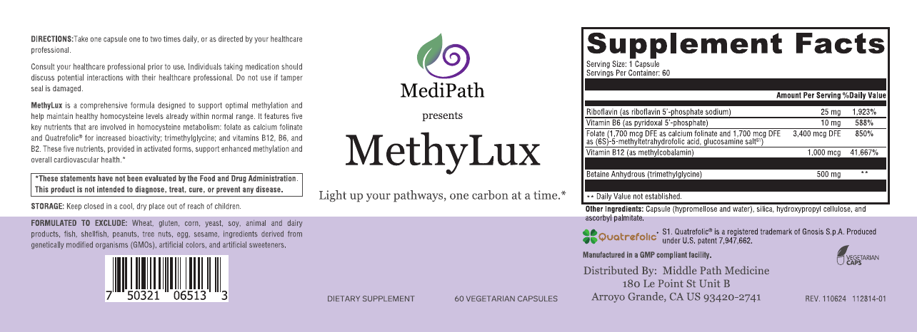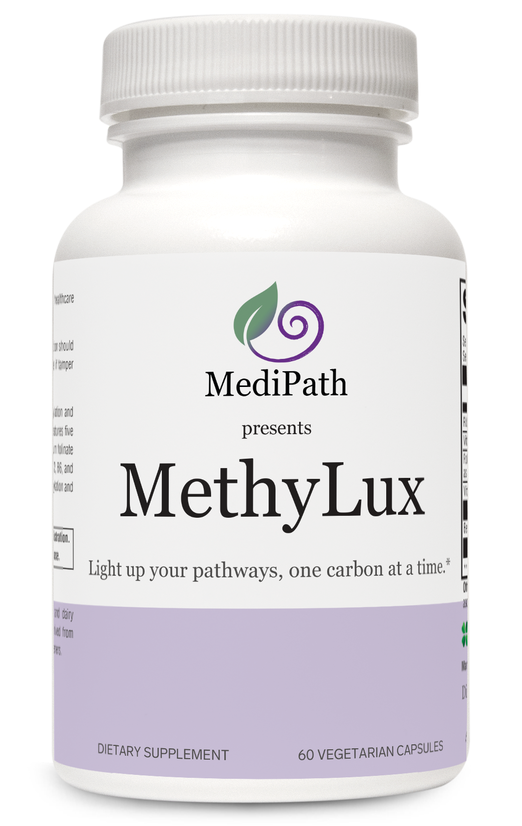 MethyLux is a comprehensive formula designed to support optimal methylation and help maintain healthy homocysteine levels already within normal range. It features five key nutrients that are involved in homocysteine metabolism: folate as calcium folinate and Quatrefolic® for increased bioactivity; trimethylglycine; and vitamins B12, B6, and B2. These five nutrients, provided in activated forms, support enhanced methylation and overall cardiovascular health.