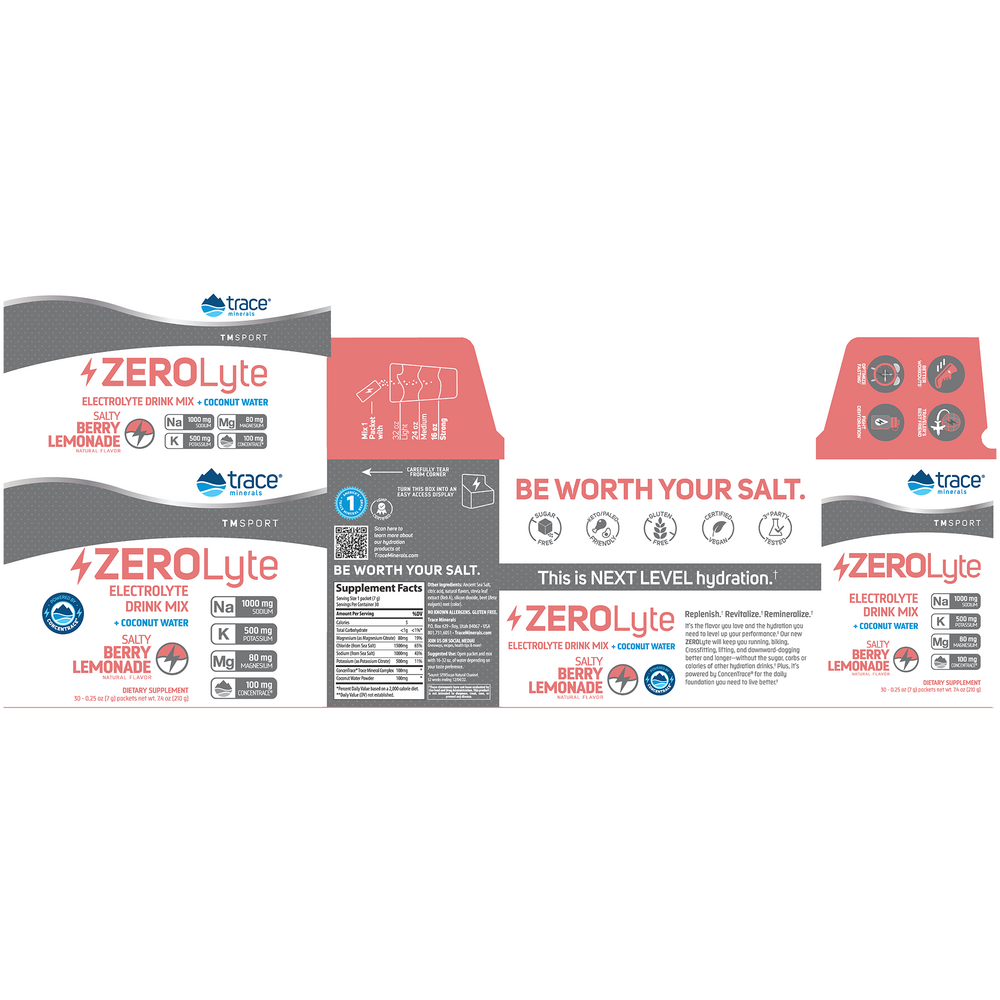 ZEROLyte is a sodium and electrolyte drink pack aimed at replenishing essential electrolytes lost through exercise and other daily activities to keep your body hydrated and full of energy. ZEROLyte supports proper nerve and muscle function and is full of high quality ingredients including ancient sea salt, coconut water, potassium, magnesium, and a full spectrum of Ionic Trace Minerals.